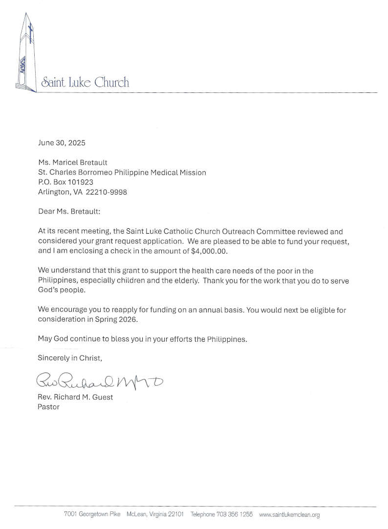 SCBPMM Receives Grant from St. Luke’s Catholic Church in McLean, VA.